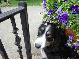 I took a lovely pic of Alfie at the ‘Pain Quotidien’ , popping his head out to say hello to the passing dogs, under the pansies (one of my favourite flowers).