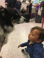 Alfie and I left on 26 June from Newark. Unfortunately, we were delayed by 3 hours as the first airplane was full of smoke! The staff seem hampered in their ability to communicate with us but luckily we just managed to get on the replacement plane just before the night curfew that started around midnight. While waiting, people were complimenting me on Alfie’s behaviour, and a fractious young baby managed to enjoy himself playing with him.
