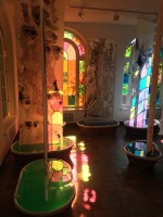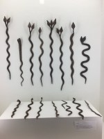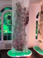 The sun was streaming into the Sunroom and Kieren Anavy was putting the finishing touches to her lovely exhibition ‘Garden of Living Images’ where the material will gradually soak up the colours in the baths underneath the hanging scrolls – beautiful!