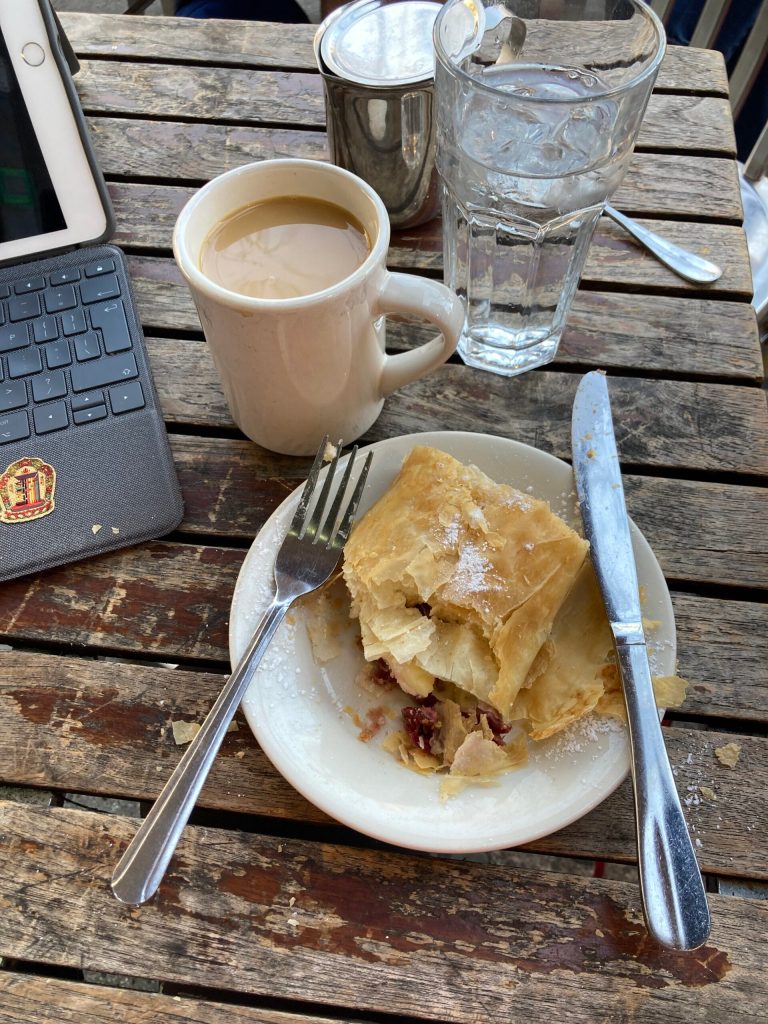 The morning walks with Ellie are followed by our usual breakfast of cinnamon and raisin toast with almond butter. In the afternoons, I often visit the Hungarian Pastry Shop to do some writing while enjoying their coffee.