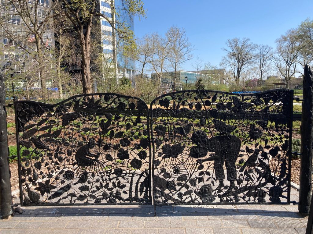 I then had a short, if hot, walk around the Battery, at South Ferry, looking at the Statue of Liberty from a distance and discovering the Battery Urban Farm with its pretty wrought-iron gates.