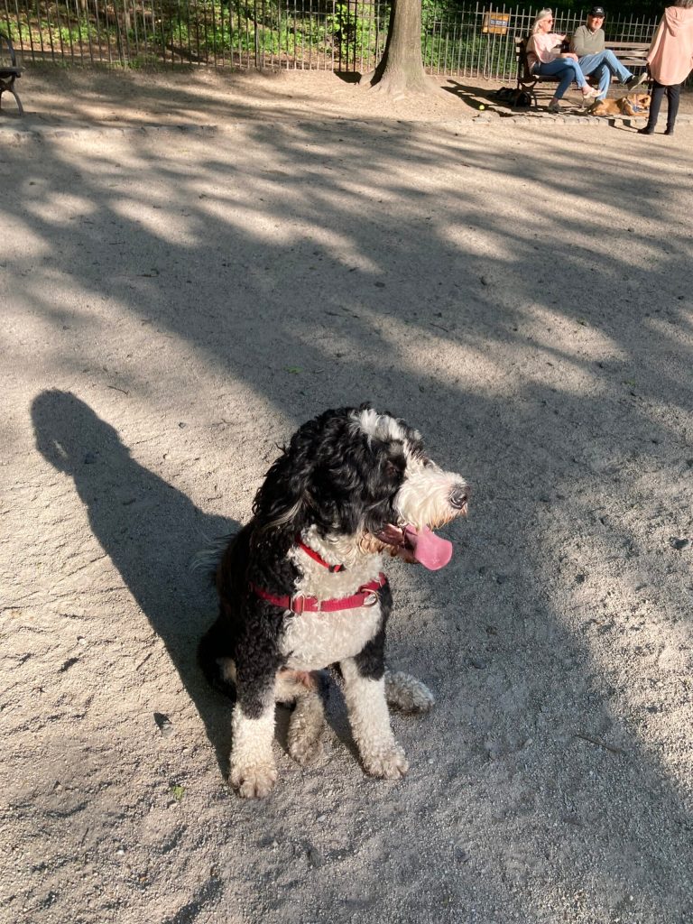 And so I compensate by taking Debbie’s seeing eye dog, Ellie, to Riverside park every morning where I used to walk my Alfie and persuading her to go to the “Dog Park” where dogs can be “off leash” (not allowed here after 9 a.m. or before 9 p.m.
