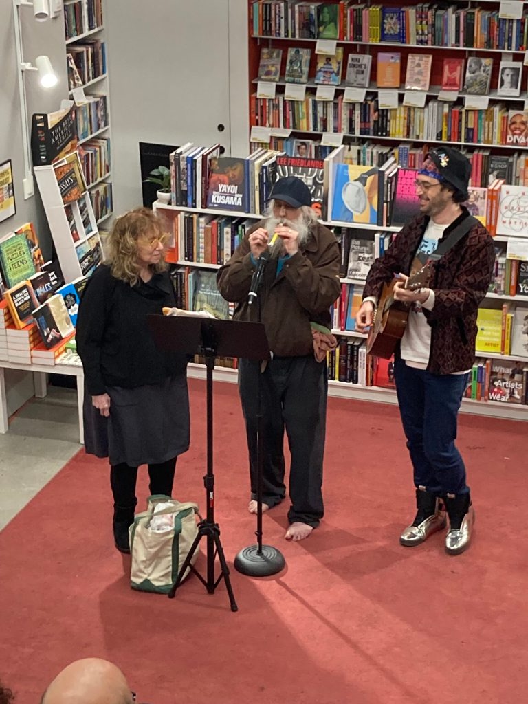 Monday evening Genia and I went to “First Floor walk up presents” down in the village to watch some absolutely off-the-wall readings of poetry and prose at “P&T knitwear Books and Cafe”