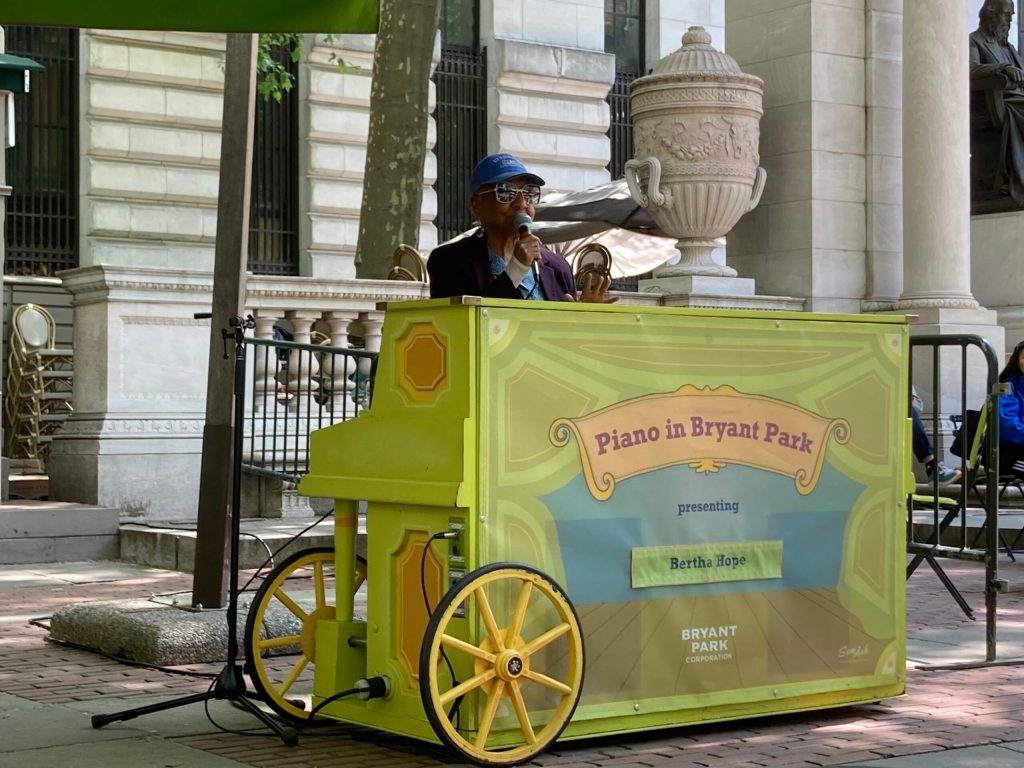 After the exhibition I walked to Bryant Park and ended up chatting to a few dog owners. As it was lunchtime, there was quaint entertainment: an elderly piano player with a local singer.
