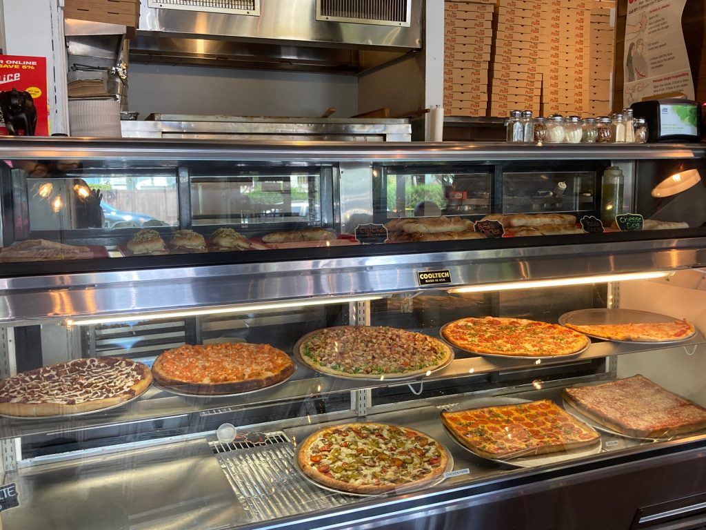 I was walking back up 5th Avenue, crossing over to arrive on Broadway that runs to Columbus Circle (59th Street) and the entrance to Central Park, and feeling peckish, I came upon a tiny tatty pizza place at 55th street that was advertising 2 (big) slices of pizza and a can (coke etc) for $3! It was actually delicious, especially with the garlic granules, herbs and chilli sauce that you could liberally sprinkle on the slices.