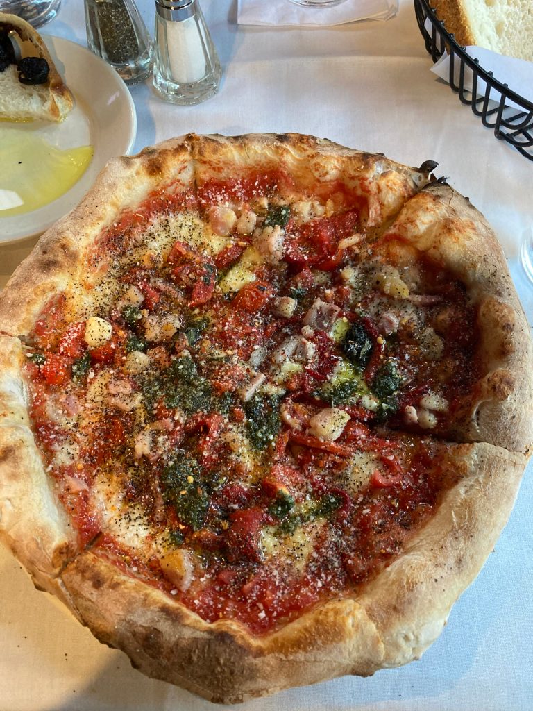 Meg then gave me the choice of a local Himalayan Restaurant and a visit to Arthur Avenue in the Bronx, a genuine ‘little Italy’ with excellent restaurants. I opted for the latter and we had a lovely meal in “Enzo’s”. At the bar, I watched a chef making the pizza dough and decided I wanted to try one – I was not disappointed. The offered olive bread with delicious olive oil to start was a tasty bonus!